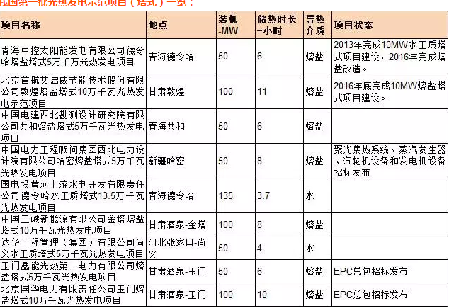 我國(guó)第一批光熱發(fā)電示范項(xiàng)目(塔式)一覽: