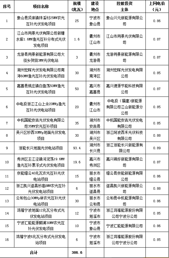 浙江省2016年度普通地面光伏電站增補規(guī)模內(nèi)項目名單