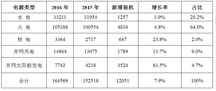 表 2:2016年全國各種類型電源裝機(jī)量統(tǒng)計(單位:萬kW)