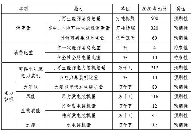 著力擴(kuò)大可再生能源電力裝機規(guī)模,提高消費比重,增強消納能力,提升產(chǎn)業(yè)技術(shù)水平。到2020年,可再生能源利用量達(dá)到500萬噸標(biāo)煤,占一次能源消費比重超過4%;可再生能源發(fā)電裝機達(dá)到212萬千瓦,占全市電力總裝機的10%;非水可再生能源消納電量(含外購可再生能源電量)占全社會用電量的比重達(dá)到10%。