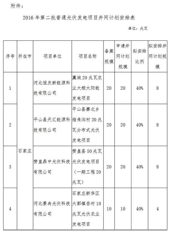 中國儲能網(wǎng)訊:按照《關(guān)于申報(bào)2016年第二批普通光伏電站并網(wǎng)計(jì)劃的通知》(冀發(fā)改能源〔2016〕1464號)要求,經(jīng)各市發(fā)改委申報(bào),省電力公司、冀北電力有限公司分別確認(rèn),現(xiàn)對2016年第二批普通光伏發(fā)電項(xiàng)目并網(wǎng)計(jì)劃安排予以公示。