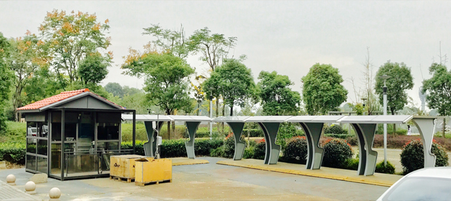 太陽能體驗屋頭戴的波浪狀小紅帽、身披的透明外衣,太陽能車棚擋板的藝術(shù)性曲線、棚頂?shù)暮贾輼?biāo)志圖案,無一不展示著整個體驗角的精致設(shè)計和杭州光伏人的用心。由于全部采用光伏建筑一體化(BIPV)技術(shù),更是保障了與周圍景觀的協(xié)調(diào)性和良好的美觀度。