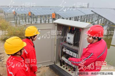 中國儲能網(wǎng)訊:11月21日,山東省東明縣,技術人員在中石化中原油田橋口聯(lián)合站光伏太陽能發(fā)電項目現(xiàn)場檢查光伏發(fā)電線路運行情況。