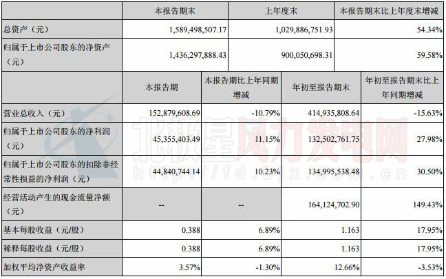 中國儲能網(wǎng)訊:金雷風電近日發(fā)布2016年第三季度報告。報告稱,金雷風電第三季度實現(xiàn)營業(yè)收入1.53億元,同比下降10.79%;實現(xiàn)凈利潤4534.54萬元,同比增長11.15%;前三季度實現(xiàn)營業(yè)總收入4.15億元,同比下降15.63%;實現(xiàn)凈利潤1.33億元,同比增長27.98%。