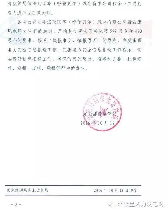 中國(guó)儲(chǔ)能網(wǎng)訊:國(guó)家能源局東北監(jiān)管局近日通報(bào)一起風(fēng)電事故。2016年5月9日,國(guó)華(呼倫貝爾)風(fēng)電有限公司新右旗風(fēng)電場(chǎng)35202風(fēng)機(jī)發(fā)生火災(zāi)事故,經(jīng)調(diào)查事故為風(fēng)電場(chǎng)生產(chǎn)管理缺陷和設(shè)備自身技術(shù)原因共同導(dǎo)致。東北能監(jiān)局依法對(duì)國(guó)華(呼倫貝爾)風(fēng)電有限公司和企業(yè)主要負(fù)責(zé)人進(jìn)行了罰款處理。以下為通報(bào)原文: