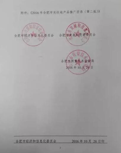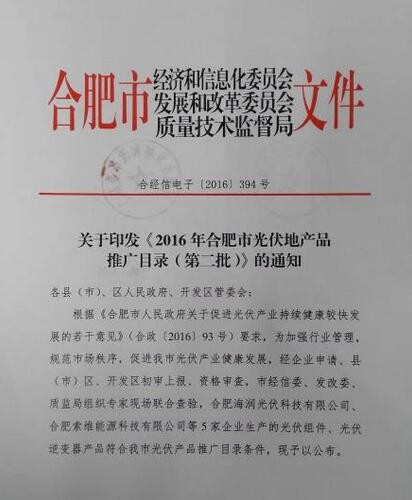 中國儲能網(wǎng)訊:10月28日,合肥市經(jīng)信委、發(fā)改委以及質(zhì)監(jiān)局聯(lián)合發(fā)布《2016年合肥市光伏地產(chǎn)品推廣目錄(第二批)》的通知。