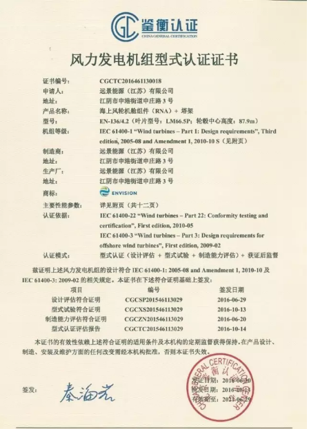 中國儲能網(wǎng)訊:近年來,中國海上風(fēng)電風(fēng)生水起,業(yè)內(nèi)一直期待的一款真正適宜中國海上復(fù)雜多變環(huán)境的大功率型式A認證機型終于來了——10月15日,全球領(lǐng)先的智慧能源技術(shù)公司遠景能源的EN-136/4.2海上智能風(fēng)機獲得國內(nèi)權(quán)威認證機構(gòu)鑒衡認證中心頒發(fā)的首個海上型式A認證證書。這對于中國海上風(fēng)電發(fā)展來說具有風(fēng)向標(biāo)意義,意味著中國海上風(fēng)電在控制風(fēng)險和保障收益的理性進程中向前邁進了一大步。