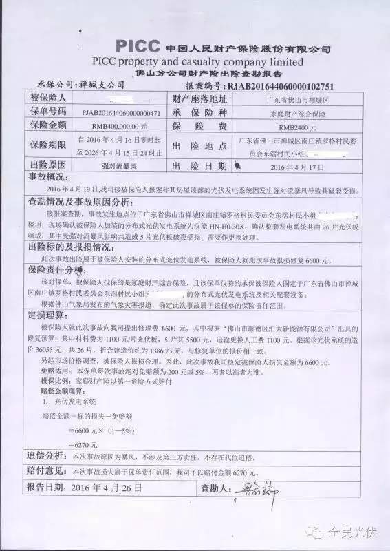 今年4月17日,南莊羅格村黎生家的分布式光伏發(fā)電設(shè)備因強對流天氣導(dǎo)致部分損壞。黎生19日報案,人保公司查勘員當(dāng)天查勘完畢,黎生25日交齊索賠資料,人保公司26日支付賠款6270元?!安榭眻蟾妗敝泻喪隽耸鹿试颍菏鹿拾l(fā)生地點位于廣東省佛山市禪城區(qū)某樓頂,現(xiàn)場確認(rèn)被保險人加裝的分布式光伏發(fā)電系統(tǒng)為XX,確認(rèn)整套發(fā)電系統(tǒng)共由26片光伏板組成,其中受強對流暴風(fēng)影響共造成5片光伏板破損受損,需要更換處理。