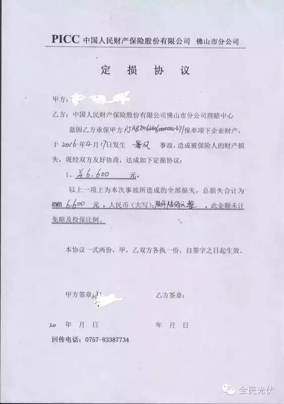 下圖為廣東省佛山市禪城區(qū)的一張光伏保險理賠報告和定損協(xié)議。該保險理賠單清楚地展示了被保險的投保金額、理賠金額和事故概況,真實展示了光伏電站的理賠全過程。