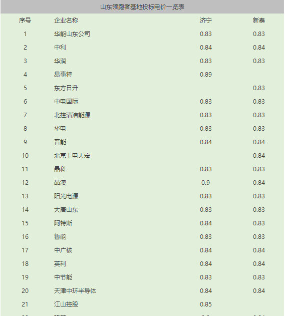 下表為山東領(lǐng)跑者基地投標(biāo)電價一覽表。其中,新泰領(lǐng)跑者基地共有43家企業(yè)參與投標(biāo),投標(biāo)電價為0.83元/千瓦時的共有23家,0.84元/千瓦時的共有16家,0.85元/千瓦時有2家,正泰報出了最高價0.9元/千瓦時。中誠銀信控股申報電價為0.75元/千瓦時,按照規(guī)則廢標(biāo)。