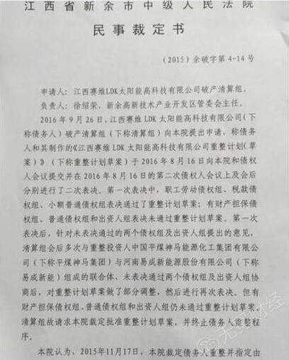 9月26日,江西賽維LDK太陽能高科技有限公司(下稱“高科技”)破產(chǎn)清算組向新余中院提出申請,裁準重整計劃草案,并終止高科技重整程序。9月30日,新余中院作出裁決,批準清算組前述申請。