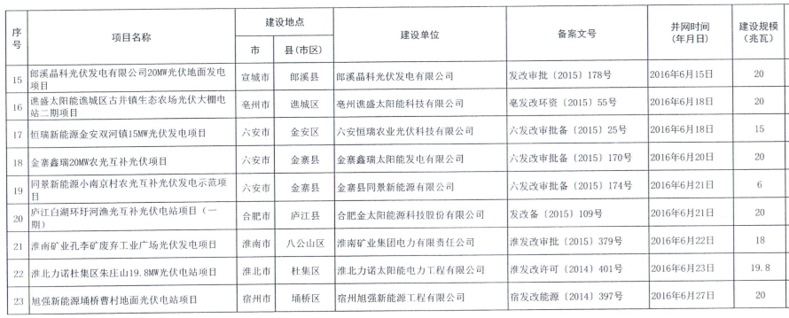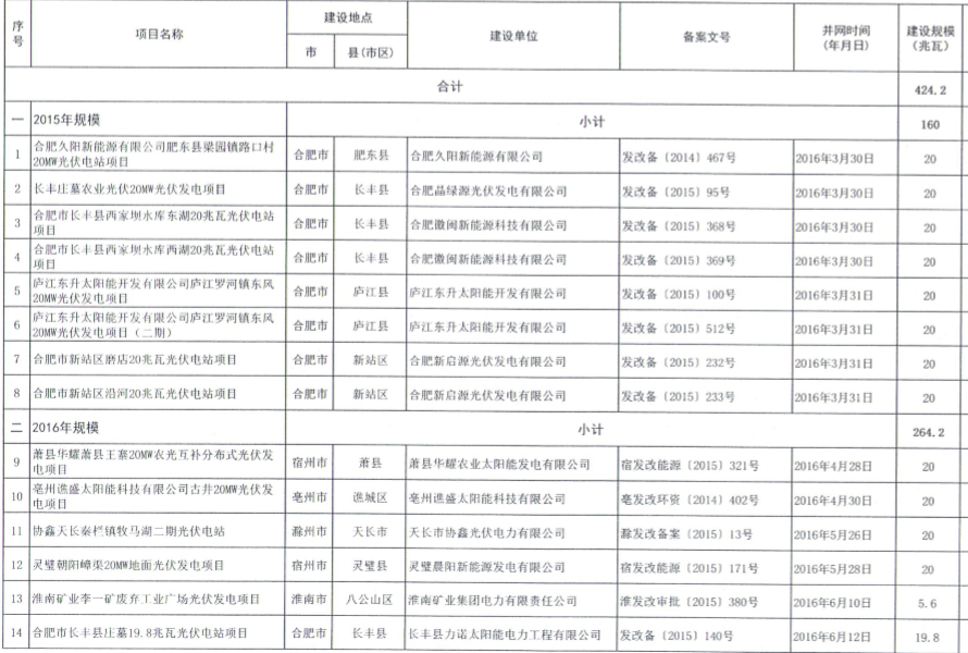 根據(jù)我局《關(guān)于進(jìn)一步加強(qiáng)光伏電站項(xiàng)目開發(fā)管理的通知》(皖能源新能〔2015〕26號(hào))和《關(guān)于完善“先建先得”分布式光伏電站管理的通知》(皖能源新能〔2016〕13號(hào))等文件規(guī)定,按并網(wǎng)先后順序,將我省2015年結(jié)余和2016年部分新增建設(shè)規(guī)模424.2兆瓦,配置給合肥久陽(yáng)新能源有限公司肥東縣梁園鎮(zhèn)路口村20MW等23個(gè)光伏電站項(xiàng)目。