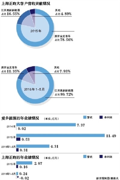 2016年1—5月,上海正昀第一大客戶的位置已由南京金龍變?yōu)榻K奧新新能源。數(shù)據(jù)顯示,上海正昀針對奧新新能源的銷售額為1914萬,營收占比卻高達80.72%,原來的第一大客戶南京金龍退居第二,對應的銷售額僅為269萬元。