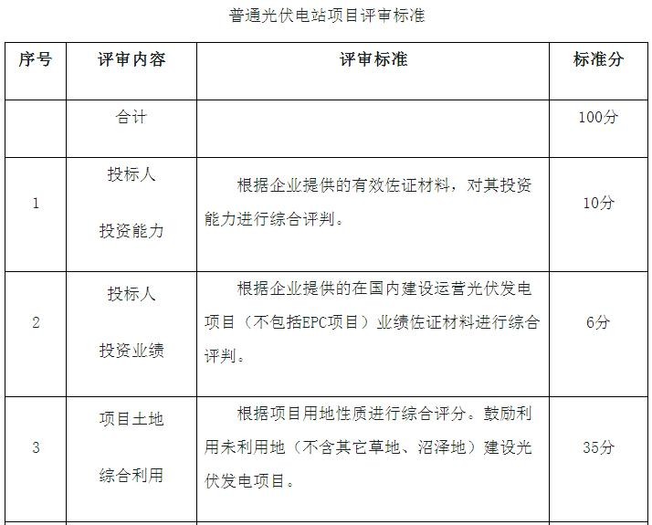 評選內(nèi)容包括上網(wǎng)電價(jià)評價(jià)、技術(shù)先進(jìn)性評價(jià)、企業(yè)投資能力和業(yè)績評價(jià)、電網(wǎng)接入評價(jià)、電力消納評價(jià)和履行社會(huì)責(zé)任評價(jià)等六個(gè)部分的內(nèi)容,詳見附件《內(nèi)蒙古自治區(qū)普通光伏電站項(xiàng)目優(yōu)選評分標(biāo)準(zhǔn)》。