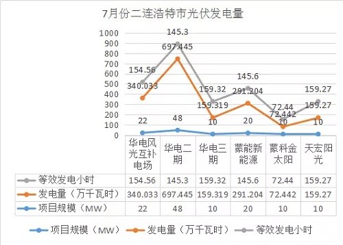 2016年7月份,二連浩特市光伏發(fā)電量為1719.713萬千瓦時(shí),同比增長11.38%,環(huán)比增長1.79%,等效發(fā)電小時(shí)約143.3小時(shí),無限發(fā)電量。