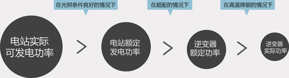問題又來了,通常中午也是一天氣溫最高的時候,逆變器工作環(huán)境溫度高,再加上部分廠家逆變器自身散熱差,導(dǎo)致了逆變器的降額。從6月份大同“領(lǐng)跑者”基地并網(wǎng)數(shù)據(jù)來看,很多業(yè)主發(fā)現(xiàn),在日照條件非常好的時候,其發(fā)電系統(tǒng)發(fā)電量反而下降。這是業(yè)主方始料未及的,出現(xiàn)這一問題的原因就是逆變器的高溫降額。下圖可以清晰說明,在光照條件良好的情況下,電站的發(fā)電系統(tǒng)發(fā)電功率是大于電站設(shè)計(jì)的額定功率的,但是在超配的情況下,逆變器的功率是小于電站額定功率的,而恰恰這個時候逆變器出現(xiàn)了高溫降額。發(fā)電效率成幾何倍數(shù)的降低,導(dǎo)致業(yè)主直接經(jīng)濟(jì)利益損失。所以部分逆變器生產(chǎn)廠家不注明具體環(huán)境溫度,來宣傳產(chǎn)品的過載能力,就是在偷換概念。