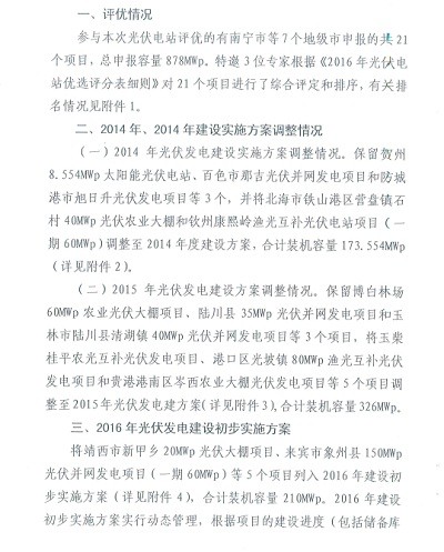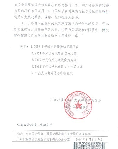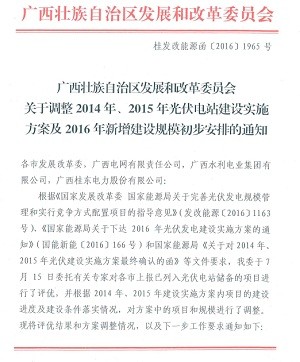 中國儲能網(wǎng)訊:日前,廣西壯族自治區(qū)發(fā)展和改革委員會發(fā)布《關(guān)于調(diào)整2014年、2015年光伏電站建設(shè)實施方案及2016年新增建設(shè)規(guī)模初步安排的通知》(桂發(fā)改能源函[2016]1965號),原文如下: