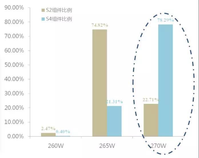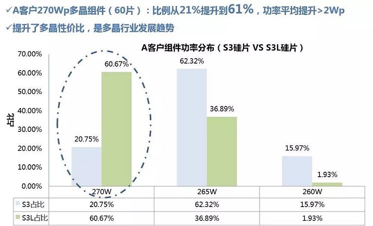 圖二是B客戶將多晶硅片由S2升級為S4之后,270Wp多晶組件的比例由23%提升至78%。