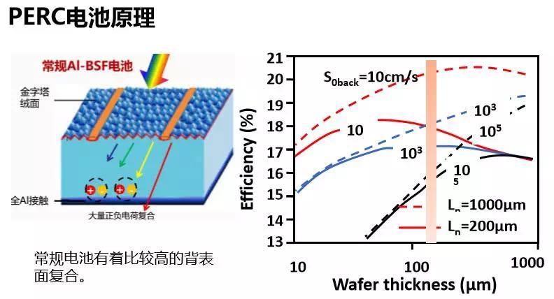 在現(xiàn)在的硅片厚度下,降低背表面復(fù)合速率可以顯著提升效率。對于擴(kuò)散長度更長的單晶來說,提升的效率更為顯著。在P型單晶硅上PERC可以實(shí)現(xiàn)1%的效率提升,多晶硅上可以實(shí)現(xiàn)0.6%的效率提升。