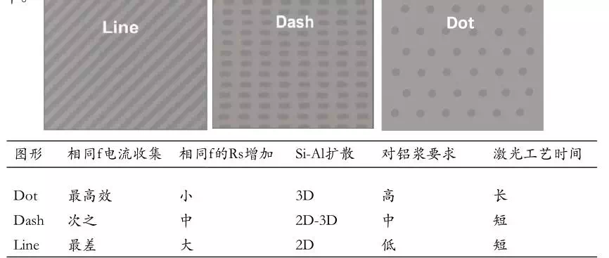 PERC電池目前提升效率的方向是優(yōu)化開孔圖形和體電阻率。理論上,dot 是最佳的,在相同的收集效果下,其合金接觸面積是最少的,因而可達(dá)到更高的Voc和Isc.但是dot 對于Al漿的要求高,形成空洞的可能性高。Dash的空洞介于line和dot 之間,對Al的要求相對低一些,更容易實(shí)現(xiàn)。