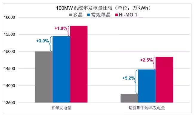 經(jīng)測算,采用低光衰的高效單晶PERC組件,年平均發(fā)電量較多晶和常規(guī)單晶高5.2%和2.5%。