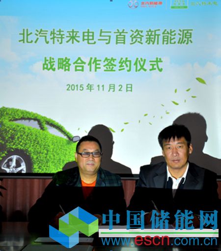 北汽特來電副總經(jīng)理張濤與北京首資新能源總經(jīng)理李根簽訂戰(zhàn)略合作協(xié)議