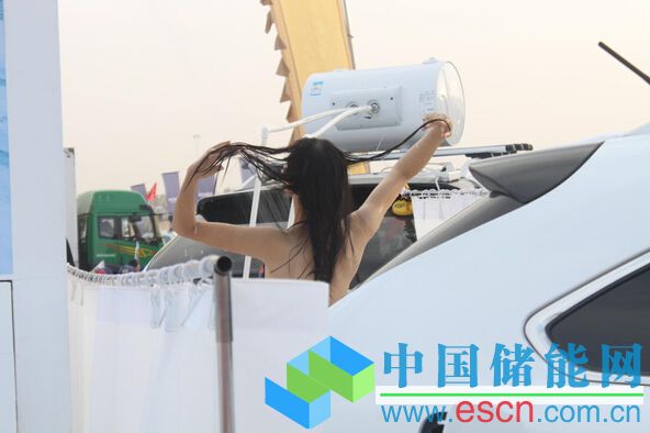 (圖為現(xiàn)場美女利用比亞迪唐移動電站燒水洗澡)