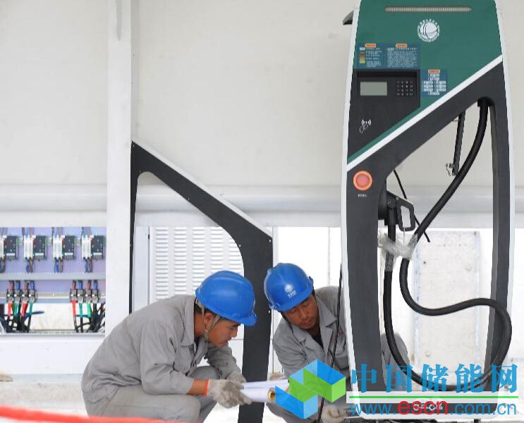 中國儲能網(wǎng)訊:10月3日,工程技術(shù)人員在京滬高速江蘇揚州氾水服務區(qū)新建的電動汽車充電站內(nèi)安裝充電樁。新華社發(fā)(濮良平 攝)
