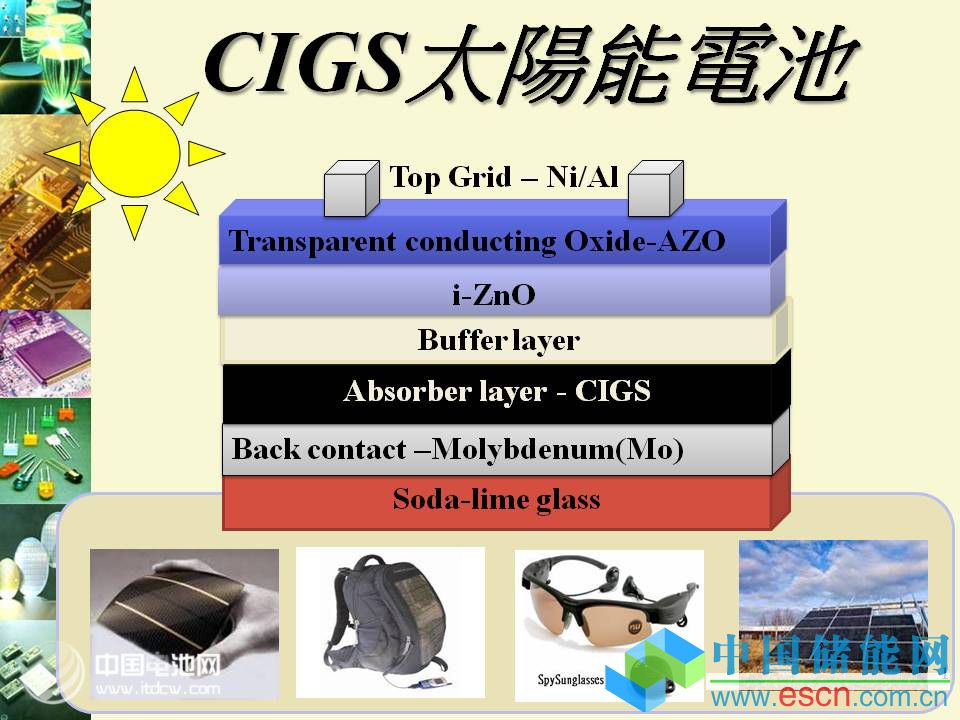 據(jù)了解,所謂CIGS薄膜太陽能電池,是由銅(Copper)、銦(Indium)、鎵(Gallium)、硒(Selenium)等幾種化學(xué)元素的化合物作為原料生產(chǎn)的薄膜化合物太陽能電池,其制備工藝有共蒸發(fā)法和濺射硒化法等。近年來,CIGS薄膜太陽能技術(shù)以其光吸收能力強、發(fā)電性能穩(wěn)定、光電轉(zhuǎn)換效率高、生產(chǎn)制造成本低、能源回收周期短等特點,已經(jīng)成為薄膜太陽能研究的“寵兒”。