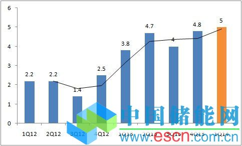 圖:2012-2014年國內(nèi)季度新增風(fēng)電招標(biāo)量(單位:GW)