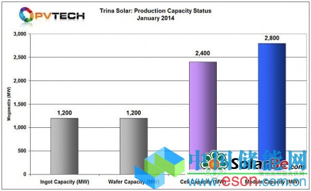 天合光能2014年初內(nèi)部太陽(yáng)能電池產(chǎn)量為2,400MW,內(nèi)部光伏組件產(chǎn)能為2,800MW,產(chǎn)生400MW的電池產(chǎn)量差距。