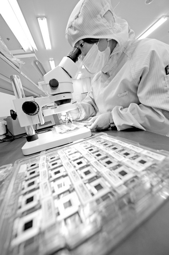中國儲能網(wǎng)訊:2月8日,安徽淮南日芯光伏科技有限公司工人生產(chǎn)高倍聚光光伏產(chǎn)品。淮南日芯光伏科技有限公司作為中國最大的LED芯片生產(chǎn)與制造企業(yè)三安光電的全資子公司,2013年,該公司完成固定資產(chǎn)投資7億元,實現(xiàn)產(chǎn)值9.5億元,利潤額9600多萬元,模組年產(chǎn)制造能力超過200兆瓦,其公司設(shè)計生產(chǎn)的1000倍聚光發(fā)電系統(tǒng)效率高達27%,模組效率接近30%,屬世界領(lǐng)先水平。