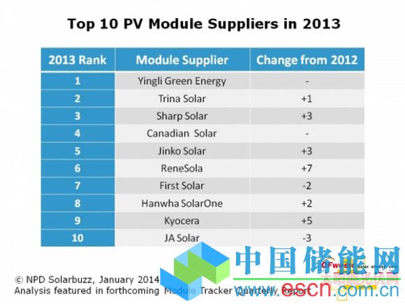 與2012年相似,排名前十位的企業(yè)中有七家是中國公開上市的垂直一體化晶硅制造商。夏普太陽能、福斯第一太陽能和京瓷是僅有的進入2013年榜單的非中國供應商。