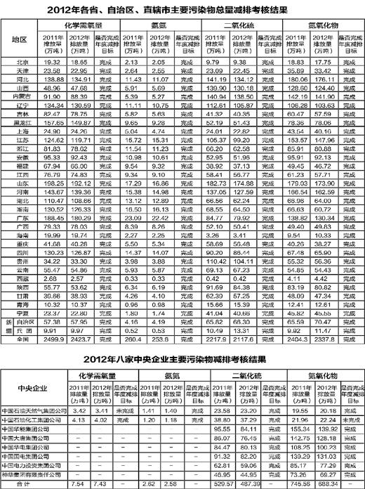經(jīng)考核,31個(gè)省、自治區(qū)、直轄市和新疆生產(chǎn)建設(shè)兵團(tuán)以及華能、大唐、華電、國(guó)電、中電投、神華六家中央企業(yè)均實(shí)現(xiàn)了2012年度各項(xiàng)主要污染物總量減排目標(biāo),通過年度考核;中石油未完成化學(xué)需氧量減排目標(biāo),中石化未完成氮氧化物減排目標(biāo),未通過年度考核。