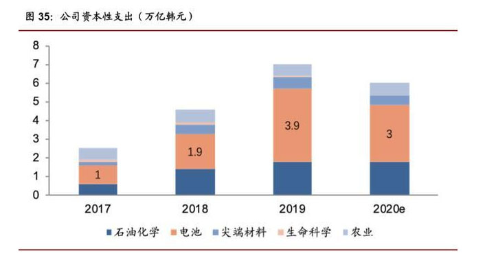資本性支出逐年遞增,電池業(yè)務(wù)的資本性支出占比最多。2019 年電池業(yè)務(wù)的資本 性支出為 3.9 萬億韓元,預(yù)計(jì) 2020 年為 3 萬億韓元,LG 在 2020 年會繼續(xù)增加 動力電池產(chǎn)能,到 2020 年底預(yù)計(jì)整體產(chǎn)能將達(dá)到 100GWh。為配合下游整體市 場增長,確保在短時間內(nèi)滿足客戶的需求并保持成本競爭力,大約 80%的產(chǎn)能將 位于中國和歐洲。