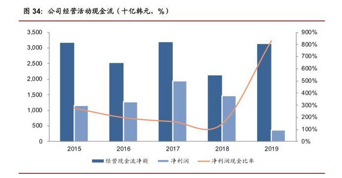 公司經(jīng)營活動現(xiàn)金流凈額小幅波動,2019 年為 183 億元,同比增加 47.01%; 2015-2018 年凈利潤現(xiàn)金比率較為平穩(wěn),2019 年大幅上升至 8.31,主要因?yàn)槭?ESS 火災(zāi)相關(guān)的一次性費(fèi)用的影響,利潤規(guī)模大幅縮小。