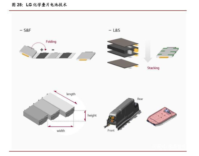 LG 化學(xué)目前采用的電芯主要路線為軟包電池,在動力電池封裝方面,采用疊片 式軟包設(shè)計(jì)。LG 電池電芯目前生產(chǎn)工藝主要為 Stack&Folding 堆疊工藝,復(fù)合電極材料置于一張隔膜上以折疊的工序完成組裝,減少了電極開裂的可能性,并有助于制作更加輕薄的電池,另外擁有高容量和高密度,發(fā)熱面積較大可以調(diào)節(jié)最適當(dāng)?shù)臏囟?,有利于保持長壽命與高性能。下一代電芯將采用新型的生產(chǎn)工藝:層壓工藝,能夠更適于生產(chǎn)高能量密度的電芯,同時通過簡化生產(chǎn)工藝,縮短電芯的單產(chǎn)時間。LG 化學(xué)在這種工藝方面具有獨(dú)家專利,層壓工藝能夠?qū)?Cell 內(nèi)部的死角空間最小化,保障電芯的長循環(huán)壽命,同時通過 LG化學(xué)高可靠 性隔膜讓電芯具有較好的熱穩(wěn)定性。