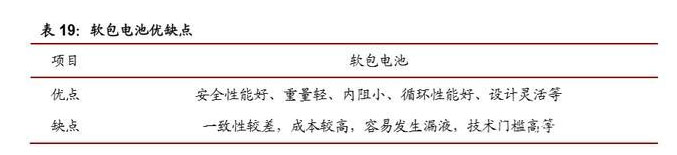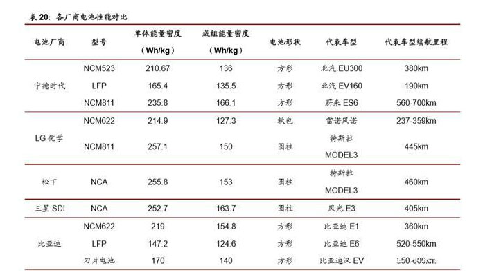 目前除寧德時代、比亞迪量產(chǎn)磷酸鐵鋰電池以外,其余各廠商都為三元鋰電池;LG 化學(xué)是唯一使用軟包外形的電池廠商,相比于方形鋁殼電池及圓柱電池,軟包電池在發(fā)生安全隱患的時候一般先脹氣,或者從沖破封印處釋放能量,不易發(fā)生爆炸,因而安全性能更高,同等容量的軟包電池要比方形鋁殼輕,具有更高的能量密度。此外,軟包電池的形狀可根據(jù)客戶的需求定制,設(shè)計(jì)上更加靈活,在新型號的電池開發(fā)上更占優(yōu)勢。通過對比各廠商已經(jīng)量產(chǎn)的不同型號動力電池性能, LG 化學(xué) NCM811 圓柱電池的單體能量密度達(dá)到 257.1 Wh/kg 排名第一。