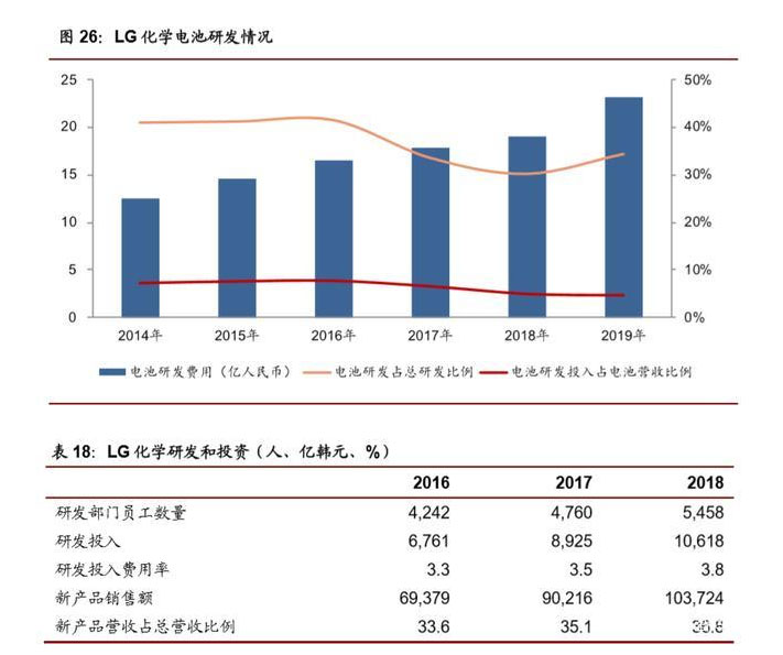LG 化學(xué)在電池方面的研發(fā)投入與研發(fā)費(fèi)用率處于行業(yè)領(lǐng)先。電池業(yè)務(wù)的研發(fā)費(fèi) 用穩(wěn)步增長,從 2014 年的 12.53 億元增長到 2019 年的 23.15 億元,復(fù)合增長率 達(dá)到 13.06%;電池研發(fā)占總研發(fā)比例在 30%-40%之間,電池業(yè)務(wù)收入占總收入 比例從 16 年的 17%增長到 19 年的 28%,LG 化學(xué)前期在電池業(yè)務(wù)研發(fā)的投入初 見成效。2014~2017 年的電池業(yè)務(wù)的研發(fā)費(fèi)用率在 7%左右,電池業(yè)務(wù)收入的增 長使得 2018、2019 年的研發(fā)費(fèi)用率分別下降到 4.92%、4.62%。高研發(fā)費(fèi)用下, LG 化學(xué)新產(chǎn)品收入占總收入比例不斷上升,2019 年達(dá)到 36.8%。