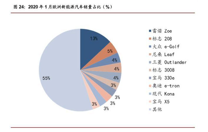 根據(jù)歐盟排放新規(guī)要求,自 2020 年起歐洲汽車制造商生產(chǎn)的新車中,95%的車 輛必須達(dá)到平均每公里二氧化碳排放量不超過 95 克;2021 年 100%的新車必須 滿足上述標(biāo)準(zhǔn)。如果不達(dá)標(biāo),每輛車每克罰款 95歐元。2020 年 1 月歐洲新能源 汽車注冊量達(dá)到 7.5 萬輛,增幅高達(dá) 121%。LG 化學(xué)電池配套的多款新能源車型 銷量增速明顯,雷諾 ZOE、標(biāo)致 208、日產(chǎn) Leaf、奧迪 etron、現(xiàn)代 Kona 均為 歐洲 1 月銷量前十車型。未來憑借多款車型在歐洲市場放量增長,LG 化學(xué)動力 電池的裝機(jī)量將持續(xù)提升。