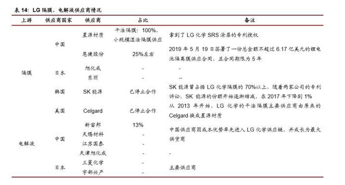 LG 化學(xué)的隔膜供應(yīng)商早期以旭化成、東麗、SK 能源和 Celgard 為主,后 LG 化學(xué)與 SK 能源關(guān)系破裂,2013 年以星源材質(zhì)取代 Celgard。2019 年恩捷股份獲 得 LG 化學(xué)大額訂單,切入濕法隔膜供應(yīng),目前 LG 化學(xué)的隔膜供應(yīng)由中國企業(yè) 主導(dǎo)。