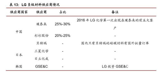 LG 化學(xué)初期的負(fù)極材料供應(yīng)商是三菱化學(xué)和日立化成,近幾年中國供應(yīng)商璞泰來、杉杉股份的份額不斷上升,成為負(fù)極材料的主要供應(yīng)商。特斯拉訂單的交付將進(jìn)一步拉動 LG 對負(fù)極材料的需求,國內(nèi)供應(yīng)商份額有望繼續(xù)上升。