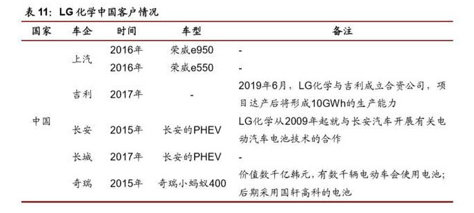 LG 化學(xué)在中國的主要客戶是吉利。2017 年吉利收購了 LG 南京工廠后,LG 將幫 助吉利集團(tuán)升級了電池技術(shù),該工廠產(chǎn)能 1GWh,可以供應(yīng) 8 萬輛混合動力汽車 的電池需求。2019 年,LG 化學(xué)與吉利成立合資公司,項(xiàng)目達(dá)產(chǎn)后將形成 10GWh 的生產(chǎn)能力。
