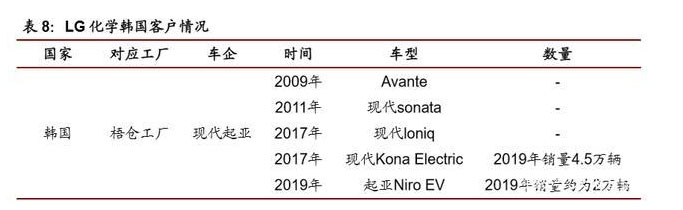 2007 年 LG 公司獲得現(xiàn)代汽車訂單,2009 年 LG 化學(xué)的第一款動力電池由現(xiàn)代 起亞共同研發(fā),LG 化學(xué)的第一家動力電池工廠——韓國梧倉工廠由現(xiàn)代 Mobis 和 LG 化學(xué)合資建立。與現(xiàn)代起亞的合作,是 LG 化學(xué)首次將自主研發(fā)生產(chǎn)的鋰 電池應(yīng)用于商用電動車,開啟了 LG 化學(xué)在動力電池的應(yīng)用步伐。十幾年來 LG 化學(xué)為現(xiàn)代 sonata、現(xiàn)代 loniq、起亞 Niro EV 等多款車型提供動力電池。2019 年 LG 化學(xué)向現(xiàn)代企業(yè)提供了 7.8 萬輛車的動力電池,2020 年現(xiàn)代汽車和 LG 化 學(xué)討論組建合資企業(yè),計(jì)劃在其它國家組建電池相關(guān)的合資公司。