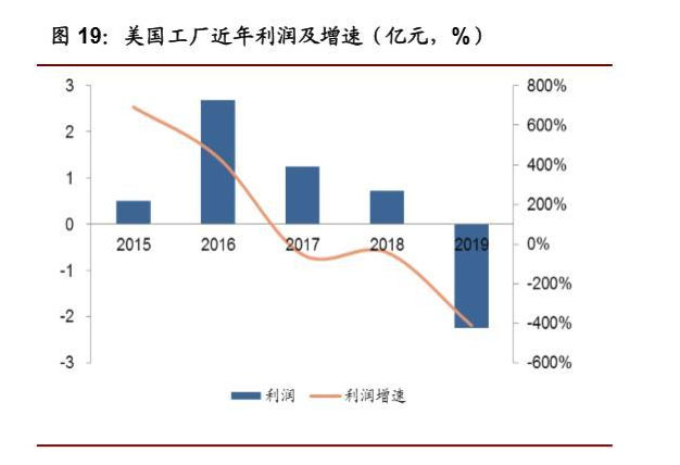 美國工廠在 2013~2019 年間收入保持上漲,但近兩年增速趨緩。2019 年收入約 合人民幣 23.78 億元,利潤為-2.25 億元。美國工廠近五年來首次出現(xiàn)虧損,主 要受近年美國新能源汽車市場增長放緩的影響。