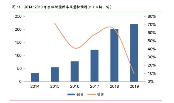 EV Sales 數(shù)據(jù)顯示,2019 年全球銷售新能源汽車約 221 萬輛,同比增長 10%。 全球電動汽車的市場份額從此前的 2.1%提升到了 2.5%,相當(dāng)于售出的每 40 車?yán)镉幸慌_電動車。