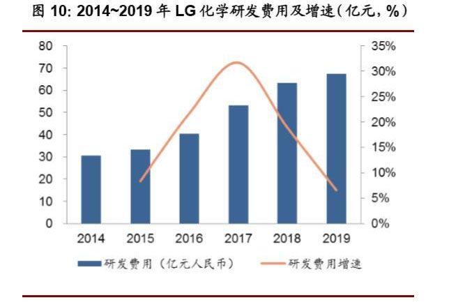 2019 年 LG 化學(xué)資本支出約合人民幣 414 億元,同比增長約 50%。2014~2019 年的資本性支出年均復(fù)合增速約 34.41%。近年公司研發(fā)費(fèi)用不斷增長,2019 年 研發(fā)費(fèi)用約合人民幣 67.55 億元,近 5 年研發(fā)費(fèi)用年均復(fù)合增長率約為 17.11%。