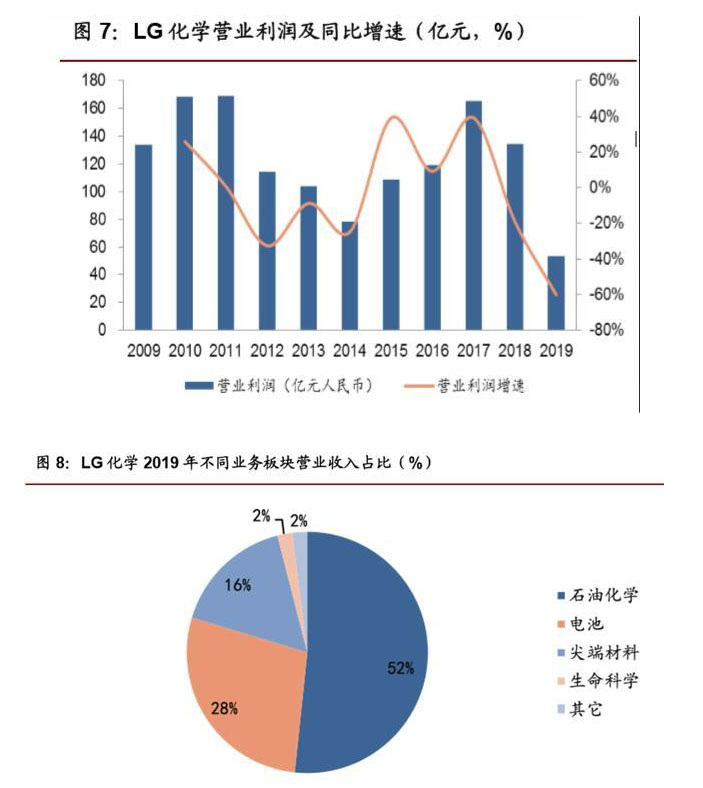 2019 年 LG 化學(xué)實(shí)現(xiàn)銷售額約合人民幣 1709 億元,同比增加 1.60%。從各業(yè)務(wù) 營收來看,石油化工板塊是公司最大的業(yè)績來源,2019 年的營收占比為 52%。 電池事業(yè)部的營收占比在快速增加,2019 年占比達(dá)到 28%,電池業(yè)務(wù)占比較 2018 年增加 5 個百分點(diǎn),預(yù)計(jì)隨著公司動力電池業(yè)務(wù)的不斷發(fā)展,電池業(yè)務(wù)營 收占比將會繼續(xù)提升。2019 年 LG 化學(xué)實(shí)現(xiàn)營業(yè)利潤約合人民幣 53.47 億元,同 比減少約 60.11%,盈利大幅下降主要原因是為應(yīng)對儲能電池火災(zāi)事故提取準(zhǔn)備 金所產(chǎn)生的非經(jīng)常性虧損。