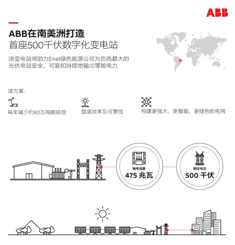 Enel綠色能源公司選擇ABB的技術(shù)建設(shè)變電站,將南美洲最大的太陽能光伏電站S?o Gon?alo電站 (位于巴西東北部皮奧伊州)發(fā)出的零碳排太陽能電力輸送到巴西500kV輸電網(wǎng)中。該電站為全球首個500kV交流數(shù)字化變電站。