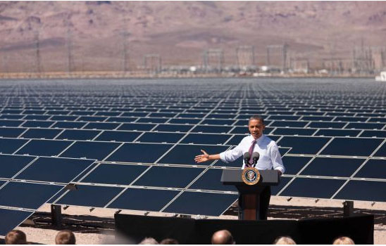 美國前總統(tǒng)奧巴馬在內(nèi)華達(dá)州的一個(gè)太陽能發(fā)電場(chǎng)開通儀式上致辭